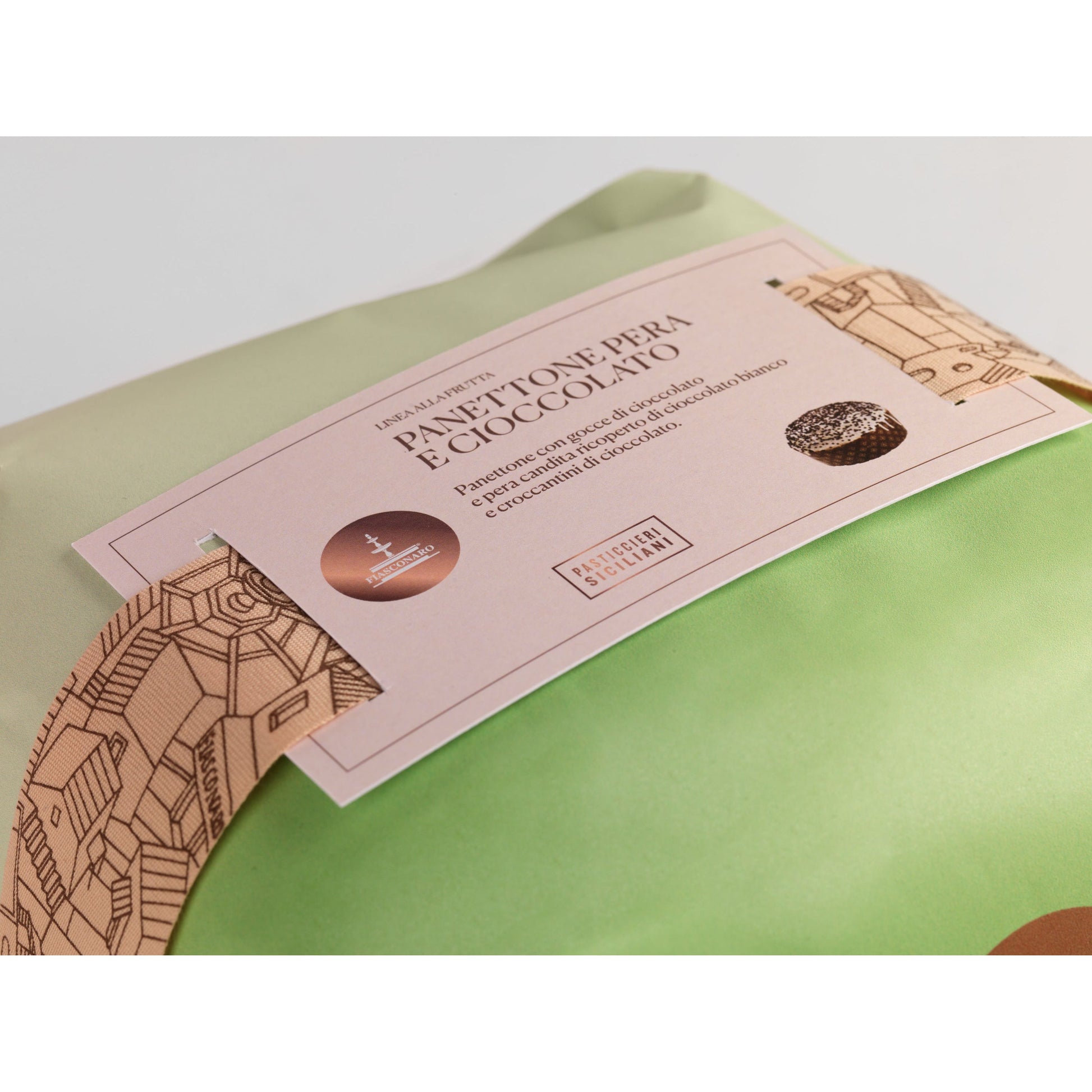 Chocolate drops and William pear core, topped with white icing and chocolate crunchies, hand-wrapped